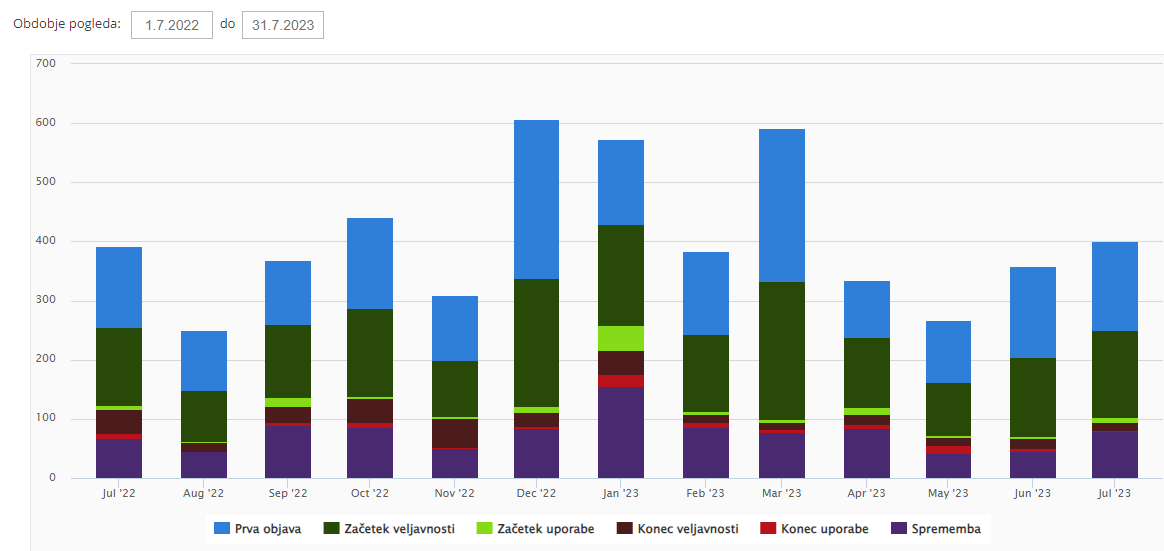 V mesecu juliju 2023 smo imeli 150 prvič objavljenih (novih) predpisov, veljati oz. uporabljati se je začelo 155 predpisov, prenehalo je veljati oz. se uporabljati 15 predpisov, spremenilo pa se je 80 predpisov.