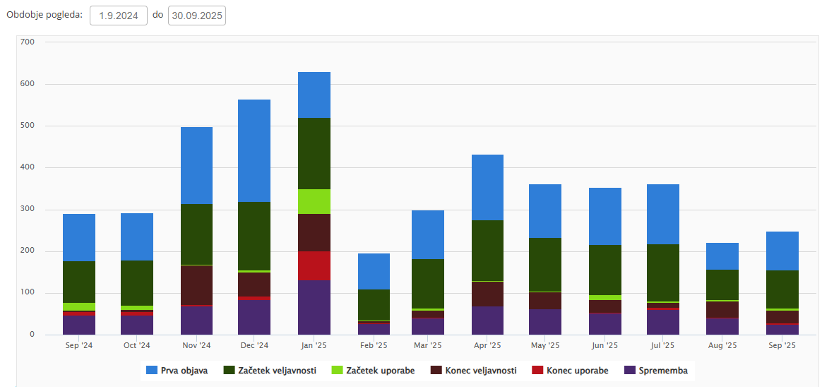 V mesecu septembru 2025 smo imeli 94 prvič objavljenih (novih) predpisov, veljati oz. uporabljati se je začelo 96 predpisov, prenehalo je veljati oz. se uporabljati 33 predpisov, spremenilo pa se je 26 predpisov.