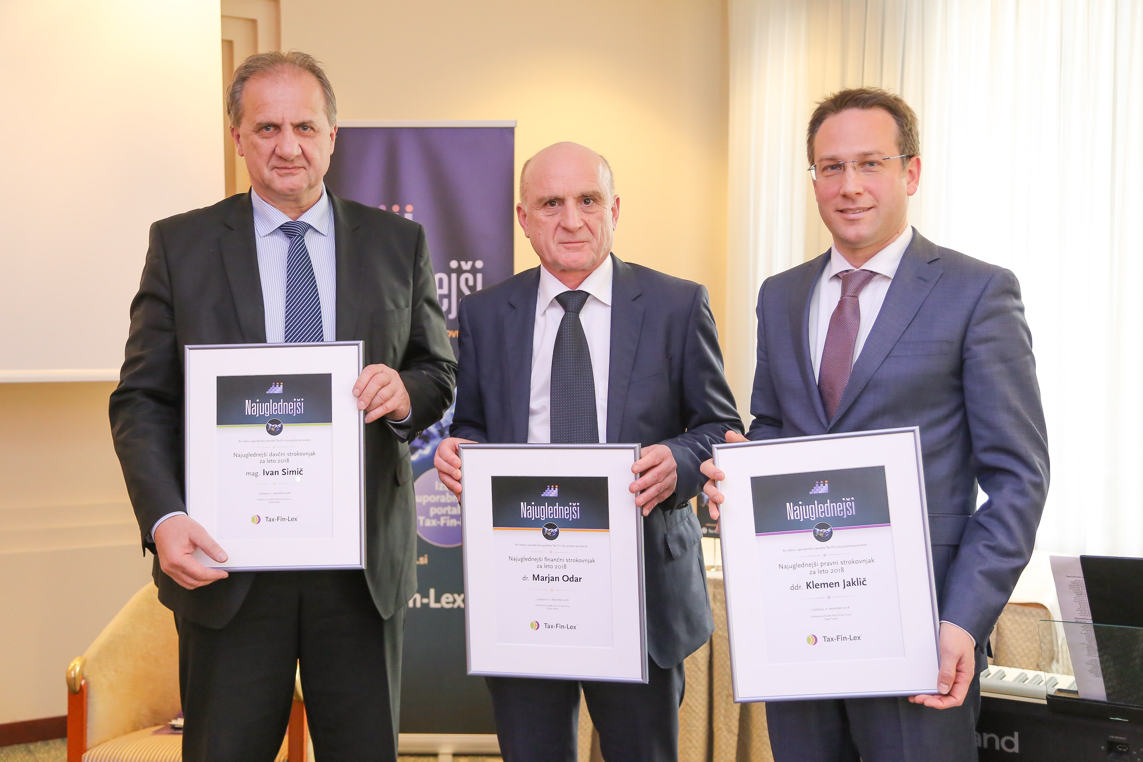 Že trinajstič so bili izbrani najuglednejši strokovnjaki z davčnega, finančnega in pravnega področja. Uporabniki portala Tax-Fin-Lex so tokrat največ glasov namenili davčnemu svetovalcu mag. Ivanu Simiču, direktorju Inštituta za revizijo dr. Marjanu Odarju in ustavnemu sodniku ddr. Klemnu Jakliču.