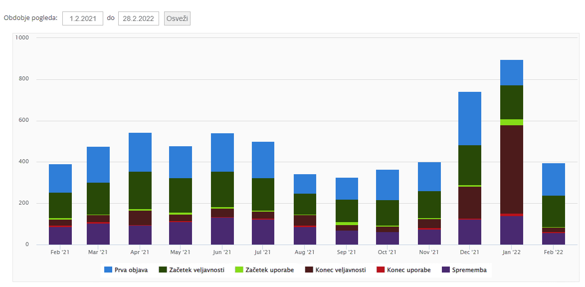 V mesecu februarju 2022 smo imeli 155 prvič objavljenih (novih) predpisov, veljati oz. uporabljati se je začelo 156 predpisov, prenehalo je veljati oz. se uporabljati 26 predpisov, spremenilo pa se je 58 predpisov.