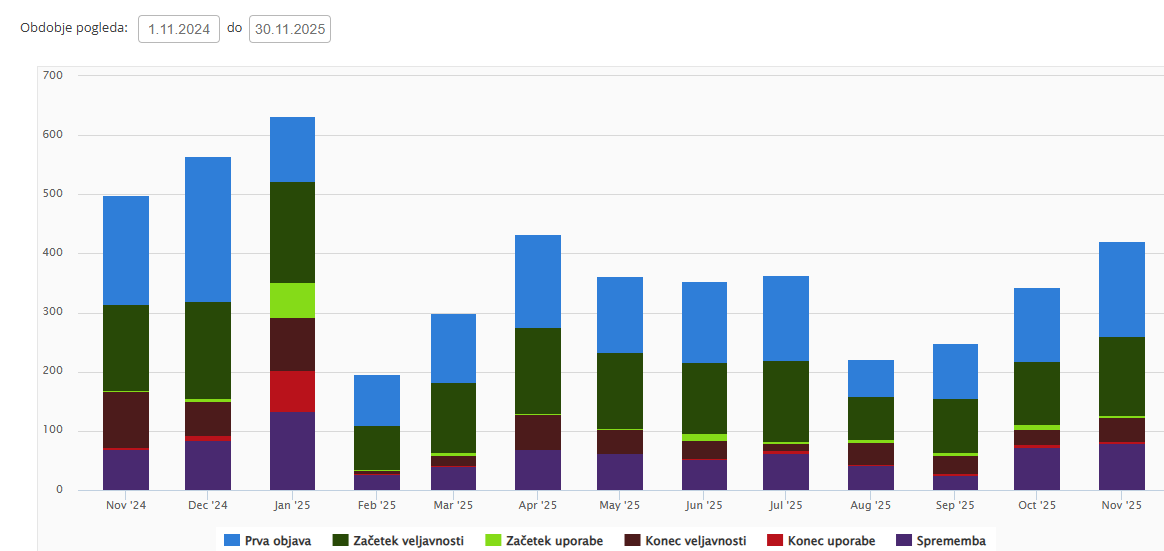 V mesecu novembru 2025 smo imeli 161 prvič objavljenih (novih) predpisov, veljati oz. uporabljati se je začelo 137 predpisov, prenehalo je veljati oz. se uporabljati 43 predpisov, spremenilo pa se je 80 predpisov.