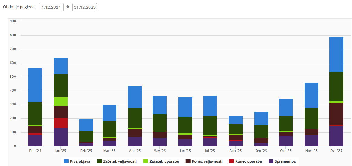 V mesecu decembru 2025 smo imeli 251 prvič objavljenih (novih) predpisov, veljati oz. uporabljati se je začelo 220 predpisov, prenehalo je veljati oz. se uporabljati 170 predpisov, spremenilo pa se je 146 predpisov.